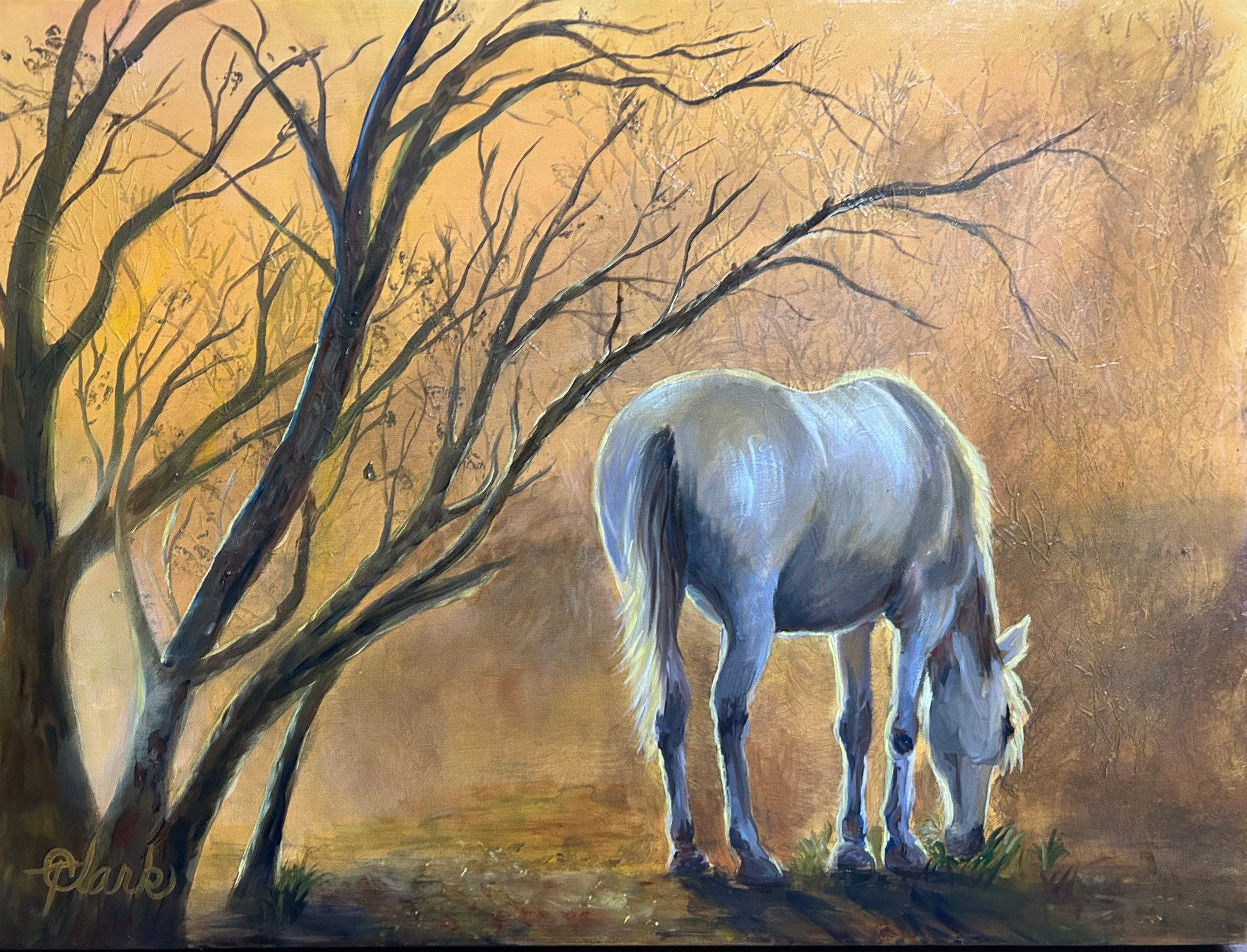 A wild horse grazes in the fading light, its attention lowered as the day settles around it. The painting captures a moment of unguarded presence — when movement slows, the land feels familiar, and the animal remains absorbed in the simple act of feeding.